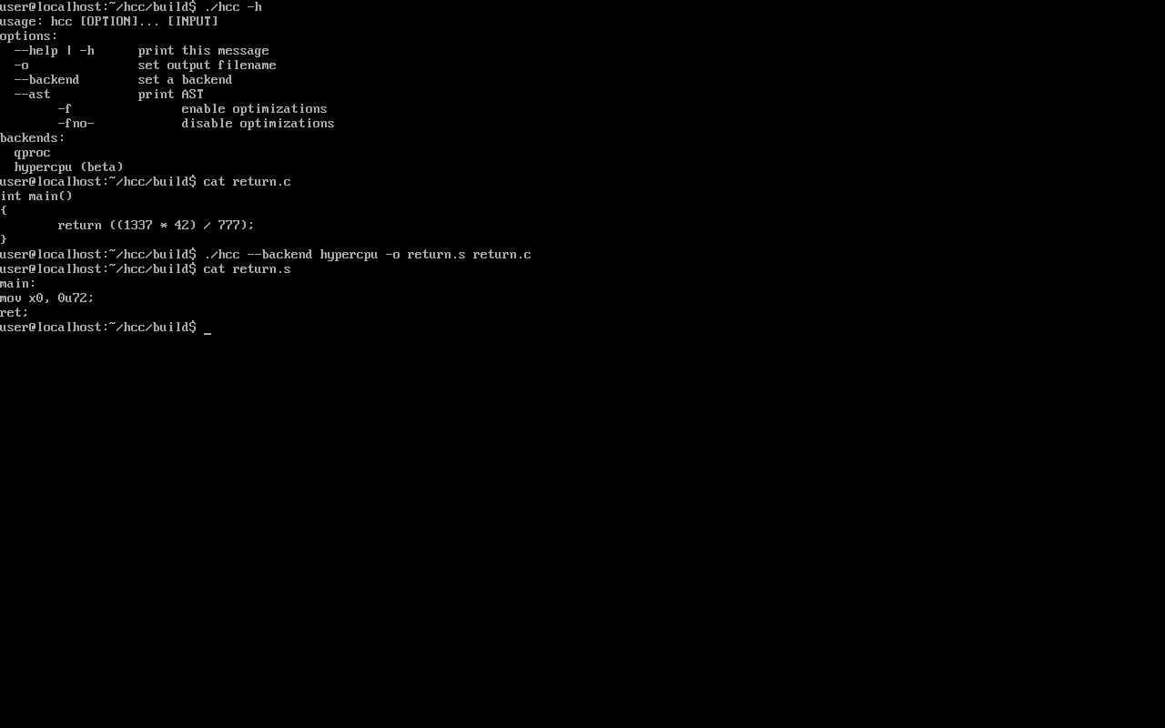 | hcc | The C compiler developed to help you write C programs for HyperCPU. |